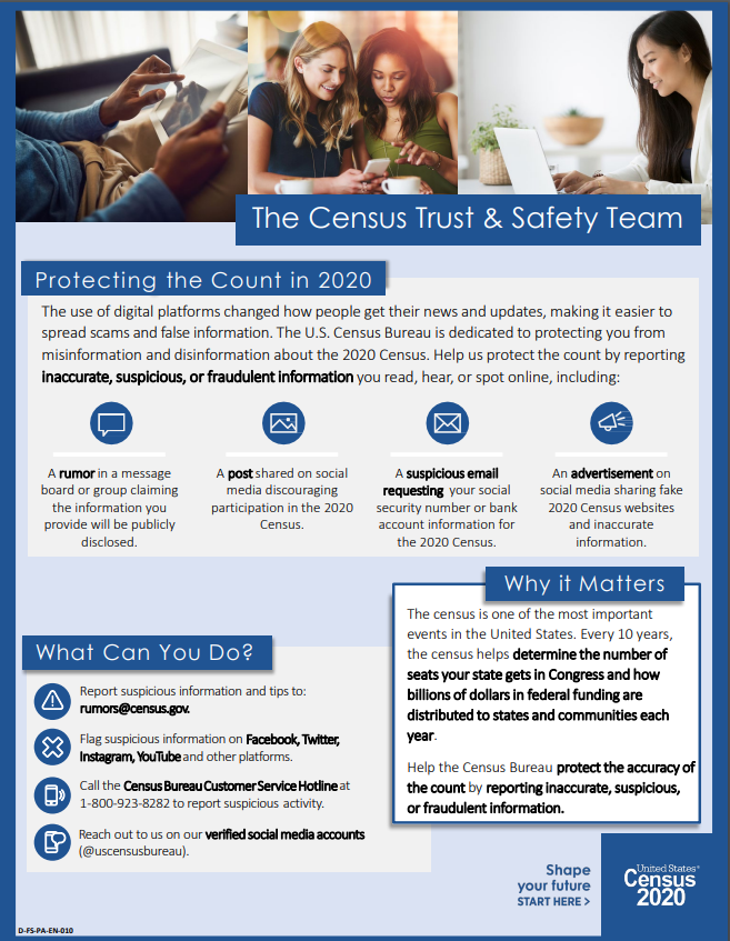“The Census Bureau’s Trust & Safety Team coordinates and integrates our efforts with external technology and social media platforms, partner and stakeholder organizations, and cybersecurity officials. It enables us to work together across the public and private sectors to protect the 2020 Census and make sure the information you receive about the 2020 Census is factual and accurate.”